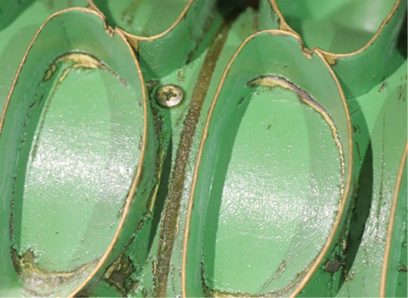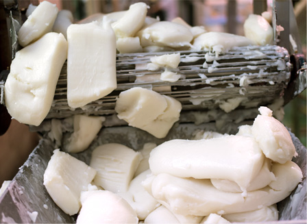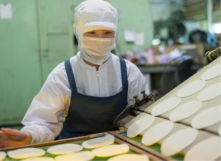 蒸しあがったモチ生地を冷やしながら薄いシートに伸ばし、型抜きしていきます。生地の堅さ、温度などを手でさわりながら確認。その日によって変わります。